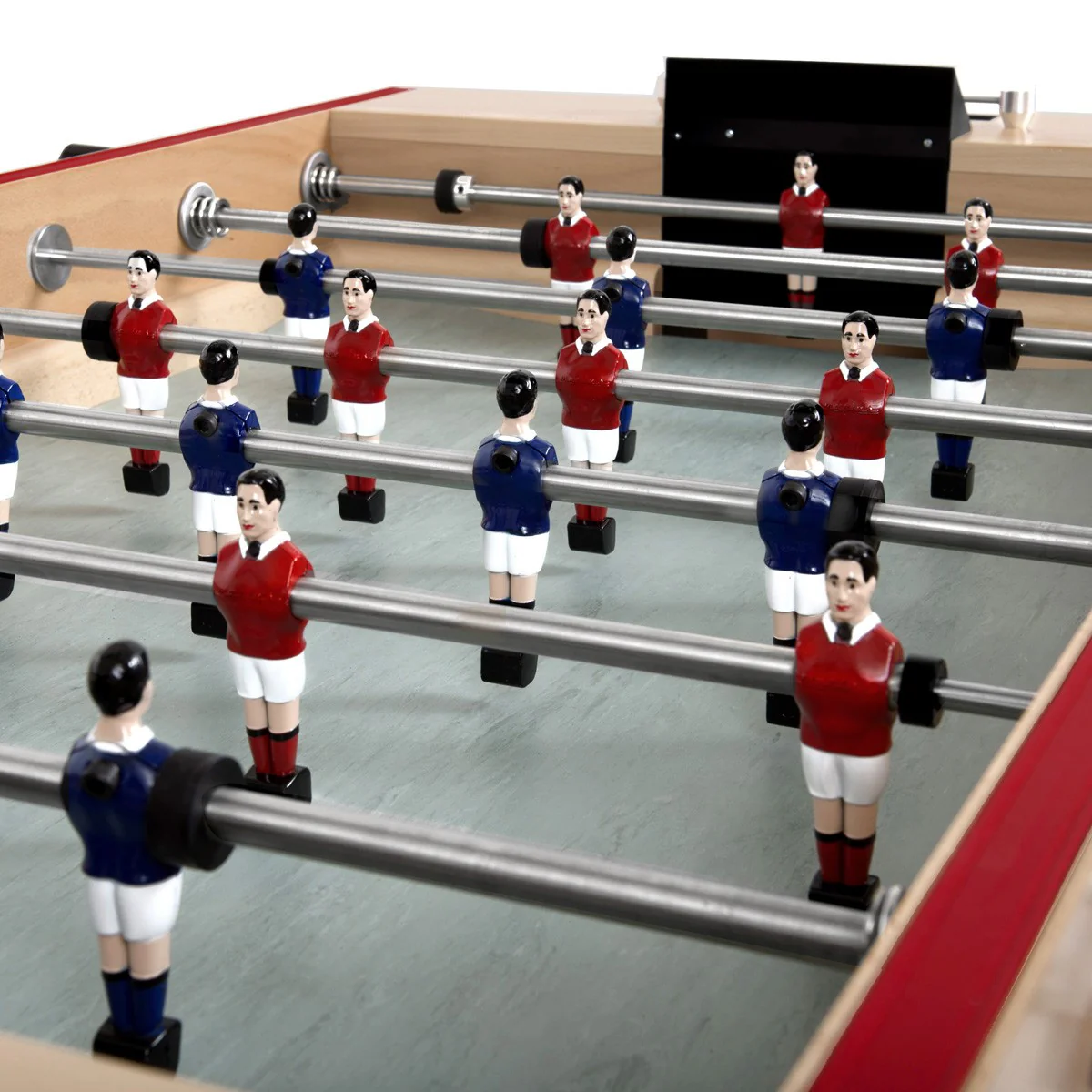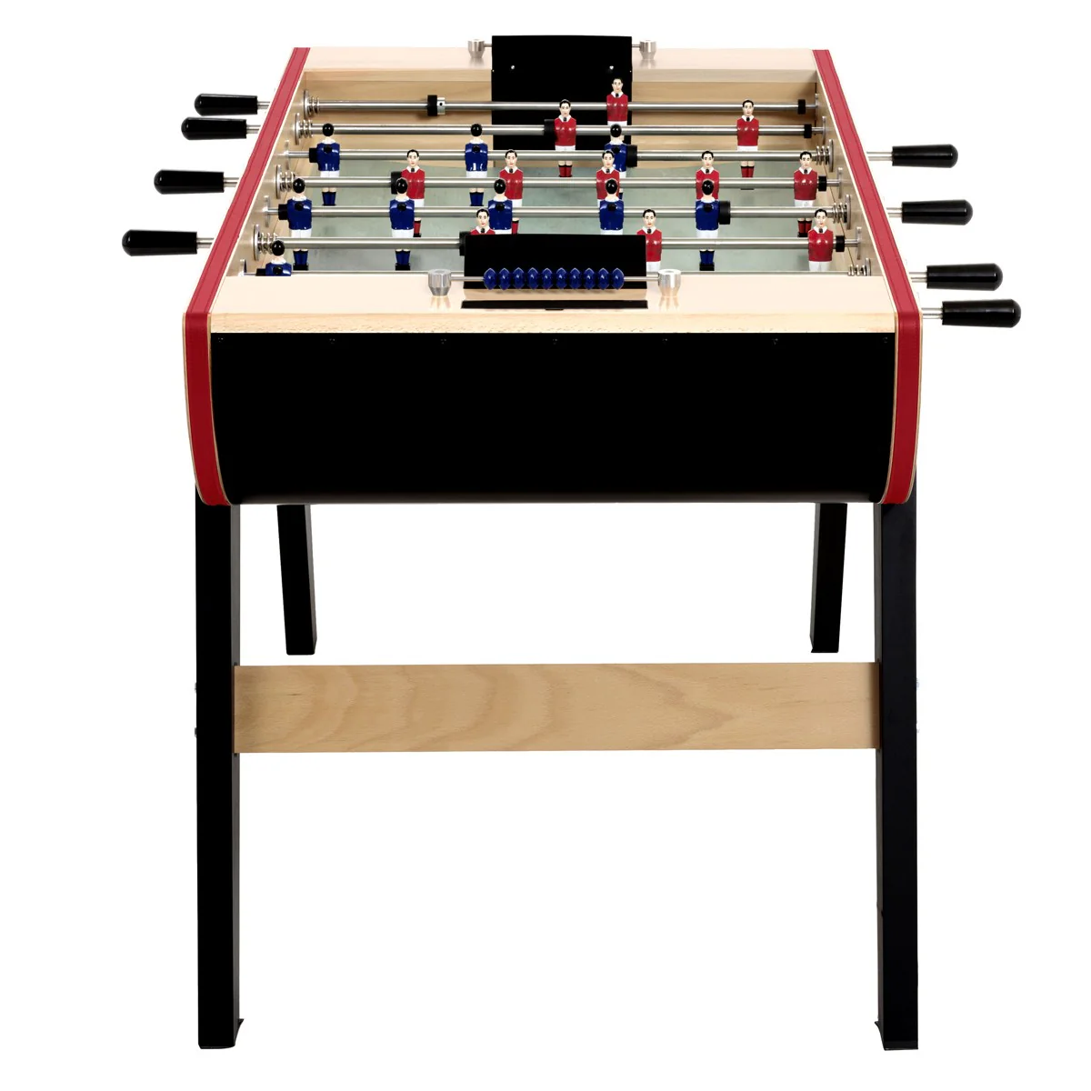 La main courante en similicuir rouge et le boulier en bois peint apportent une touche de luxe rare sur le marché du baby-foot.