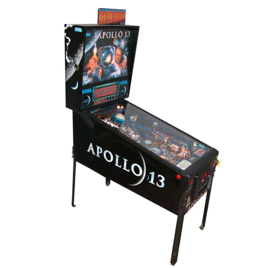 Flipper Apollo 13 (Occasion) de 1995 par Sega. Classique vintage sur la mission spatiale/film culte. Bon état général, jouable, avec Multibille unique à 13 billes, fusée animée et son original.
