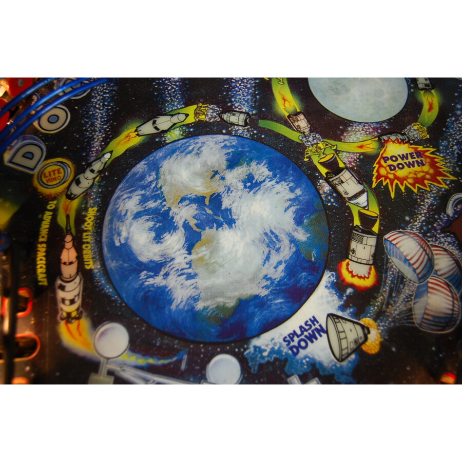 Ce flipper Apollo 13 est en bon état général pour son âge et jouable (selon les standards habituels pour ce type de machine d’occasion). Il retranscrit l’histoire de cette mission complexe : alors que le décollage de la fusée Saturn V pour une alunissage habité se déroulait en 1970, personne à la NASA ne se doutait que 25 ans plus tard, cette mission (qui rencontra des problèmes) serait adaptée au cinéma et transformée en un flipper avec des caractéristiques de jeu exceptionnelles et uniques. On pourrait croire que les ingénieurs de la NASA eux-mêmes l’ont conçu, mais c’est bien à l’équipe de développeurs et designers de SEGA que l’on doit ces idées géniales. Sur un plateau au design spatial riche en rampes à grande vitesse et en boucles, se trouvent des éléments comme la Lune, dont l’attraction retient les billes, et une fusée Saturn V détaillée qui s’incline en position de décollage en fonction du nombre de tirs réussis et qui simule même un lancement ! La bande son « Spirit in the Sky » de Norman Greenbaum comme musique d’ambiance assure l’apesanteur nécessaire pendant les parties. Les phrases originales de l’équipage comme Jack Swigert, Fred Haise et la réplique sans doute la plus célèbre du commandant Jim Lovell : « Houston, nous avons un problème » créent une tension qui vous donnera la chair de poule. En mode vidéo, le joueur tente de poser la capsule spatiale sur la Lune, et avec beaucoup d’adresse, vous pouvez déclencher le Multibille unique à 13 billes – oui, vous jouez avec 13 billes en même temps ! Des phrases comme « Est-ce que tout est clair chez vous ? Ici, c’est le contrôle au sol ! » renforcent l’immersion. C’est une machine incroyable, pleine de suspense, de défis et d’histoire.