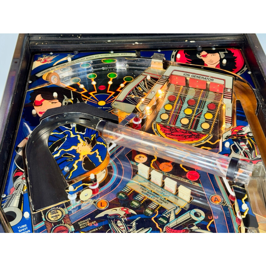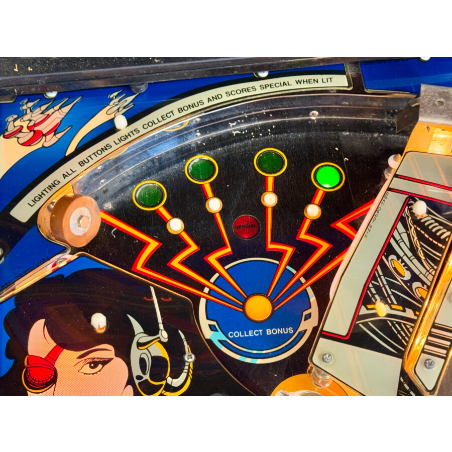 Flipper Bally Cybernaut (Occasion) de 1985. Classique vintage Bally 80s thème sci-fi. Bon état et prêt à jouer (platines 100% testées). Jupe légèrement tordue.