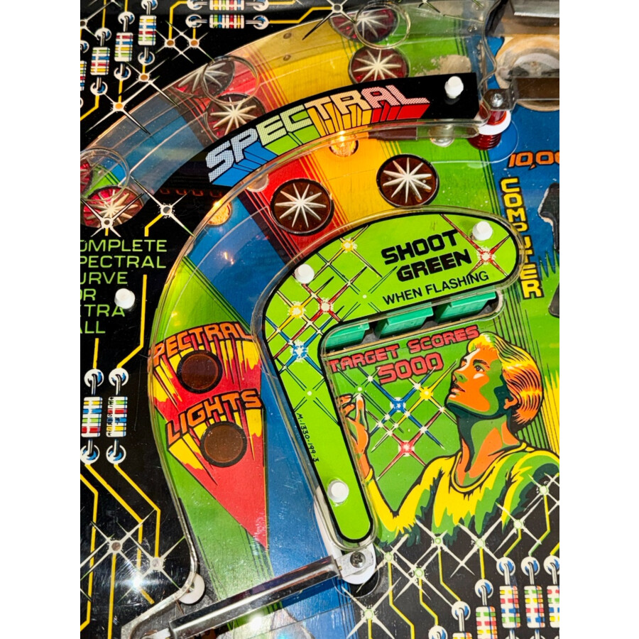 Flipper Bally Spectrum (Occasion) de 1982. Un classique vintage électronique, thème Spectrum. État jouable sous conditions (restauration ancienne, non entièrement testé). Inclut protection de plateau.