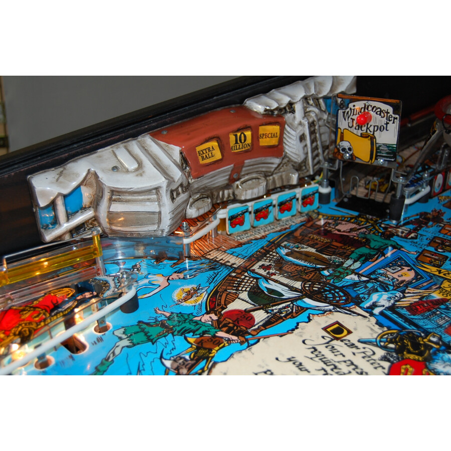Ce flipper Hook est en bon état et prêt à jouer. Il est basé sur l’histoire du film : Peter Pan a grandi, a quitté le Pays Imaginaire, s’est marié et a eu deux enfants. Mais Capitaine Crochet, toujours assoiffé de vengeance, enlève les enfants dans un monde caché. Vous devez les trouver et les sauver avec l’aide des Enfants Perdus et de la fée Clochette, qui redonnent à Peter Pan et à vous l’imagination enfantine pour pouvoir voler et combattre à nouveau. Cette histoire est parfaitement retranscrite dans la conception ingénieuse du plateau, avec une grande rampe en boucle de 360° et un crâne qui sert de point de verrouillage pour le Multibille du Pays Imaginaire, offrant une grande profondeur de jeu. Le son numérique stéréo avec les voix originales des acteurs du film crée une immersion totale ! C’est un incontournable pour tout fan du film ou amateur de flippers vintage qui cherche une expérience de jeu unique et pleine d’aventure.