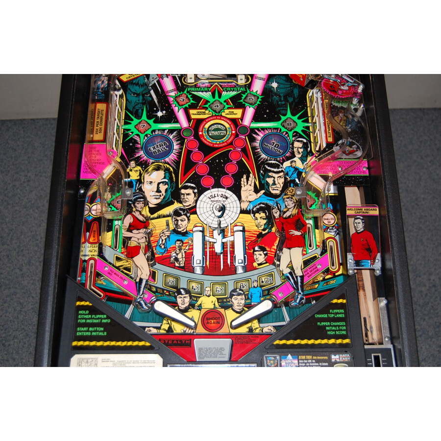 Flipper Star Trek (Occasion) de 1991 par Data East. Classique vintage sur la série TV culte. Bon état général, jouable, avec Multibille et fonction « Beam Up ».
