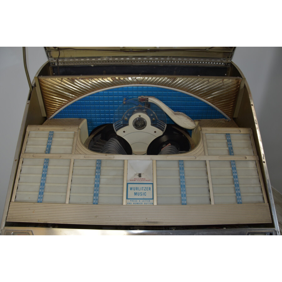 Cet appareil est vendu non restauré, non jouable en l’état et non testé dans son ensemble. Il présente les nombreuses traces de son utilisation passée et nécessite une attention technique et esthétique significative pour retrouver sa splendeur et sa fonctionnalité. La technique semble complète autant que l’on puisse en juger, mais non testée globalement. L’amplificateur est également non testé et devrait être révisé. Esthétiquement, le boîtier est dans son état d’origine avec des traces d’utilisation, la grille présente de la rouille superficielle et de petits dommages, et la plinthe/socle est lâche ou manquante par endroits. Le chrome est en bon état mais avec des légères rayures et piqûres. Les couvercles latéraux du mécanisme sont cassés. Le dôme en verre est en bon état. L’appareil est un import US en 110V 60Hz et les serrures/clés sont manquantes (la boîte est ouverte). C’est une base intéressante pour un collectionneur averti ou un restaurateur de se procurer ce modèle vintage Wurlitzer Stéréo.